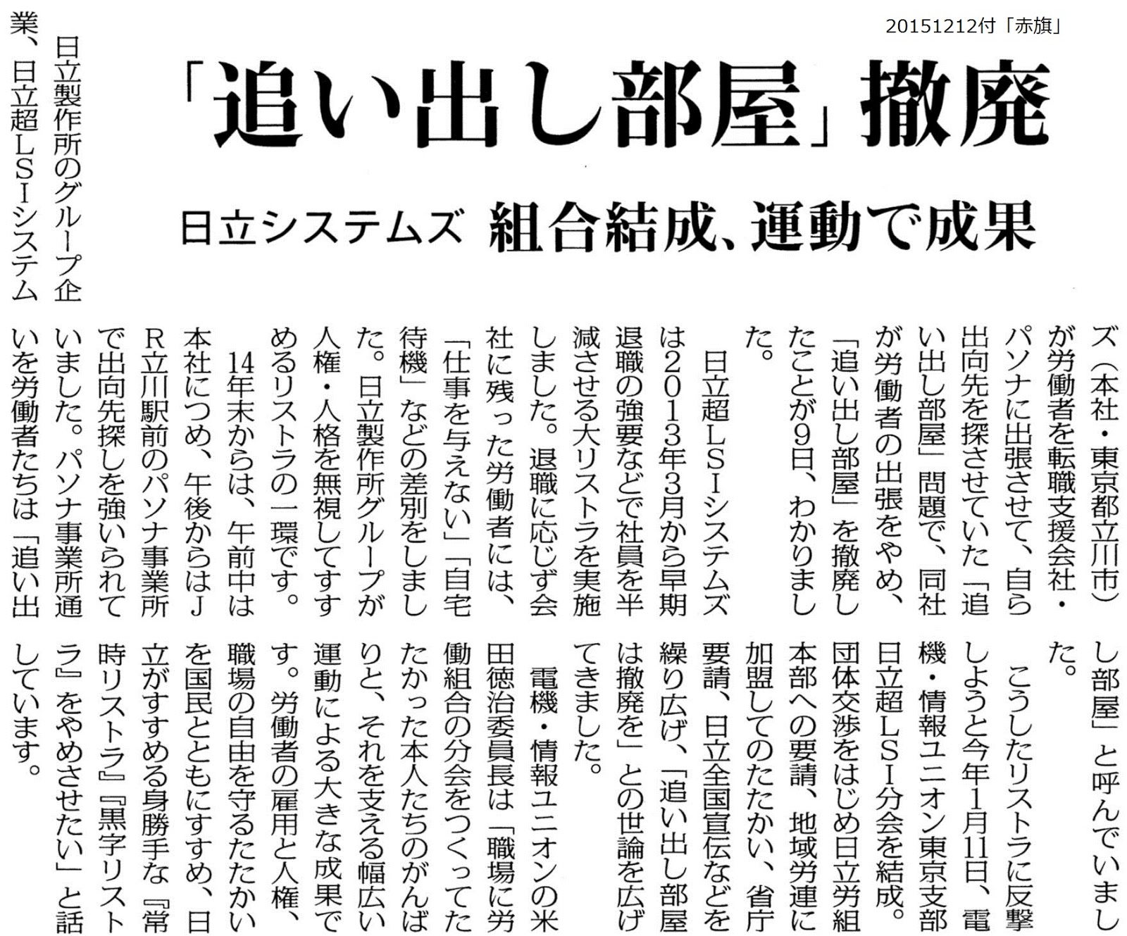 日立による大リストラから雇用と暮らしを守るために力を合わせよう 報道記事 追い出し部屋 撤廃 日立超lsiシステムズ 組合結成 運動で成果